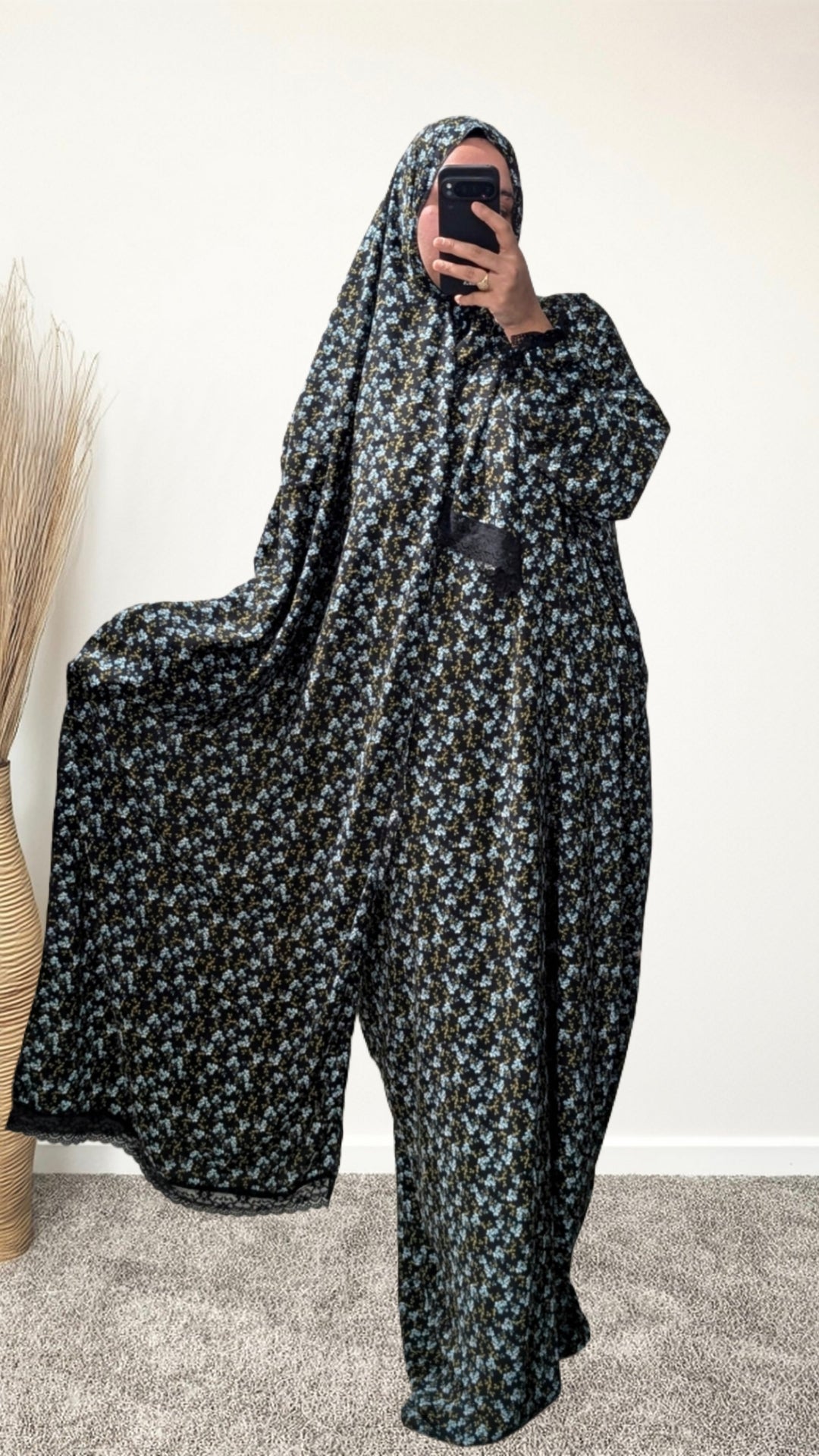 Modest Prayer Abaya With Hijab | Black Ditsy Floral