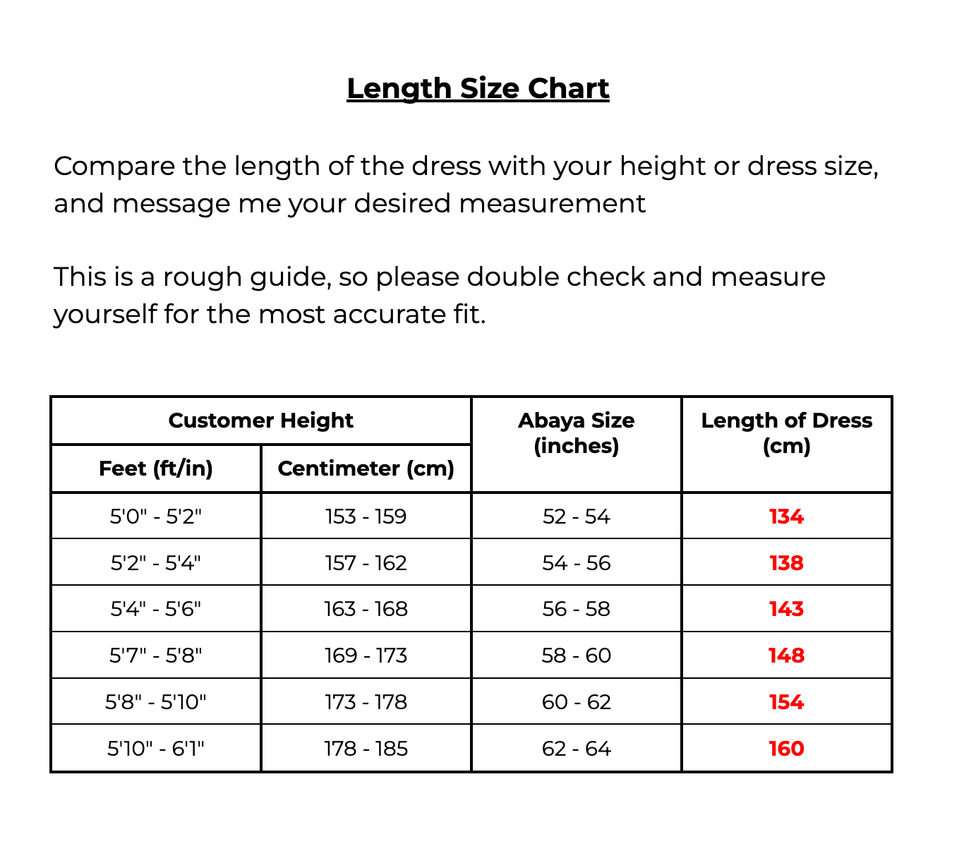 Please refer to this size chart below to determine the height adjustment needed for your abaya. Compare the length of the dress with your height or dress size, and add the preffered length in 'Order notes' section at check out or you can email your desired measurement