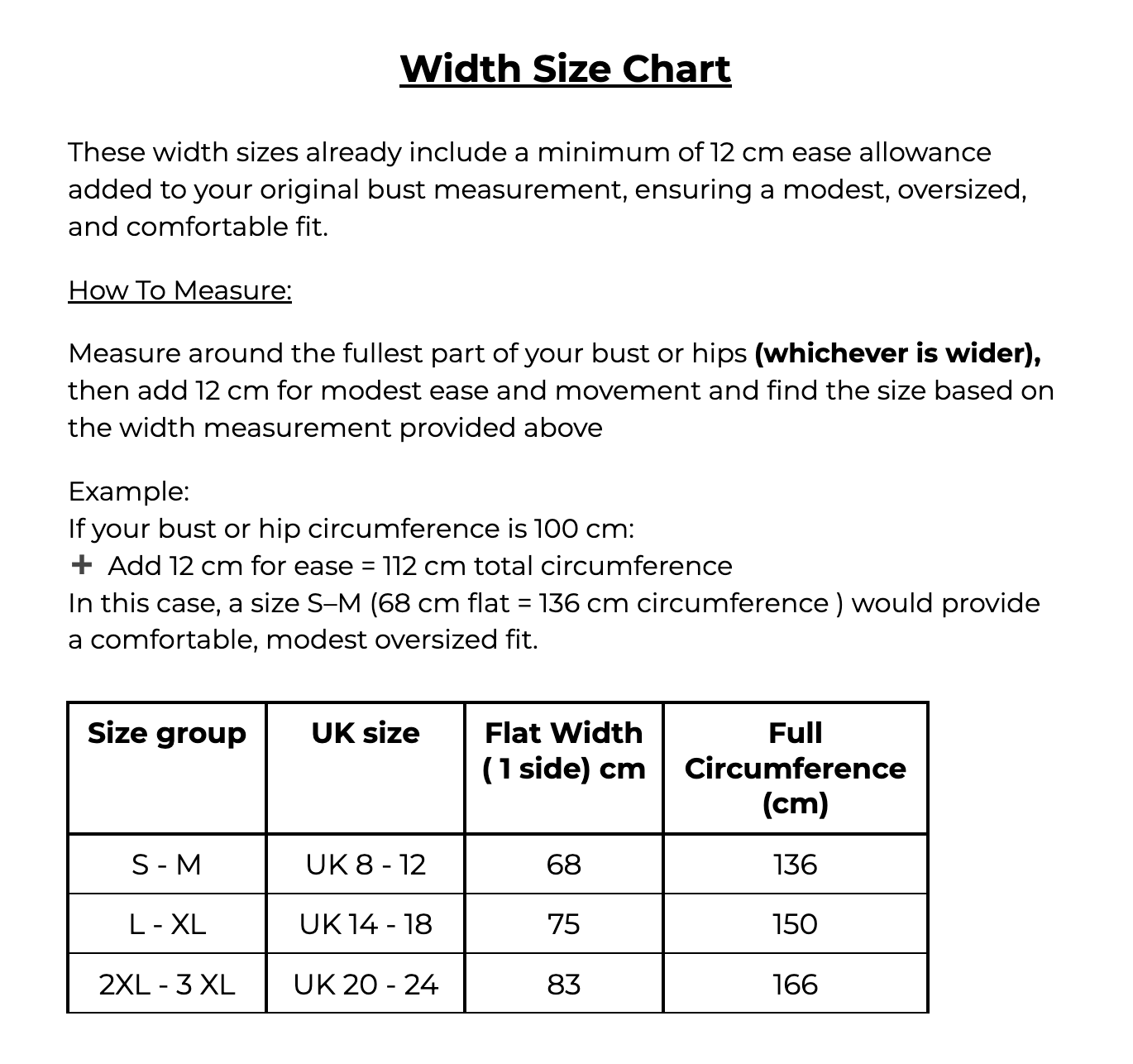 Please note: measurements are based on bust size. For example, if your bust is around 70 cm ( full circumference 140cm ) we recommend L/XL or 2XL/3XL for comfort and ease. Please refer to the size chart for exact width measurements. Leave your choice in the “Order Notes” at checkout or email us, confirmation will follow.